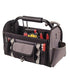 Soft shell open tool bag with collapsible sides and removable PVC base. Provides easy access of all contents. Incorporates a strengthened bar with cushion grip for ease of mobility. Features 4 open pouches 1 covered pocket 1 D-ring 6 outer attachment loops and 14 inner attachment loops.
